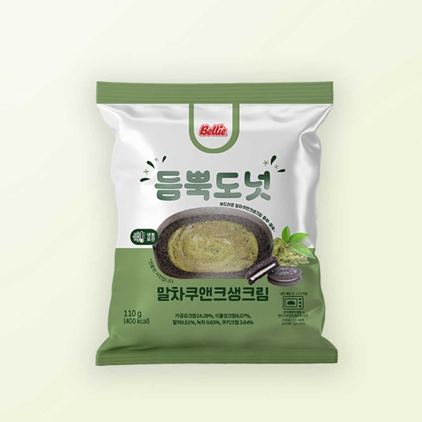 부드럽고 커다란 도넛 속에 진한 말차 쿠앤크 생크림이 가득한 말차쿠앤크생크림도넛 #벨리도넛 #베를리너도넛 #듬뿍도넛 #개별포장 #낱개포장